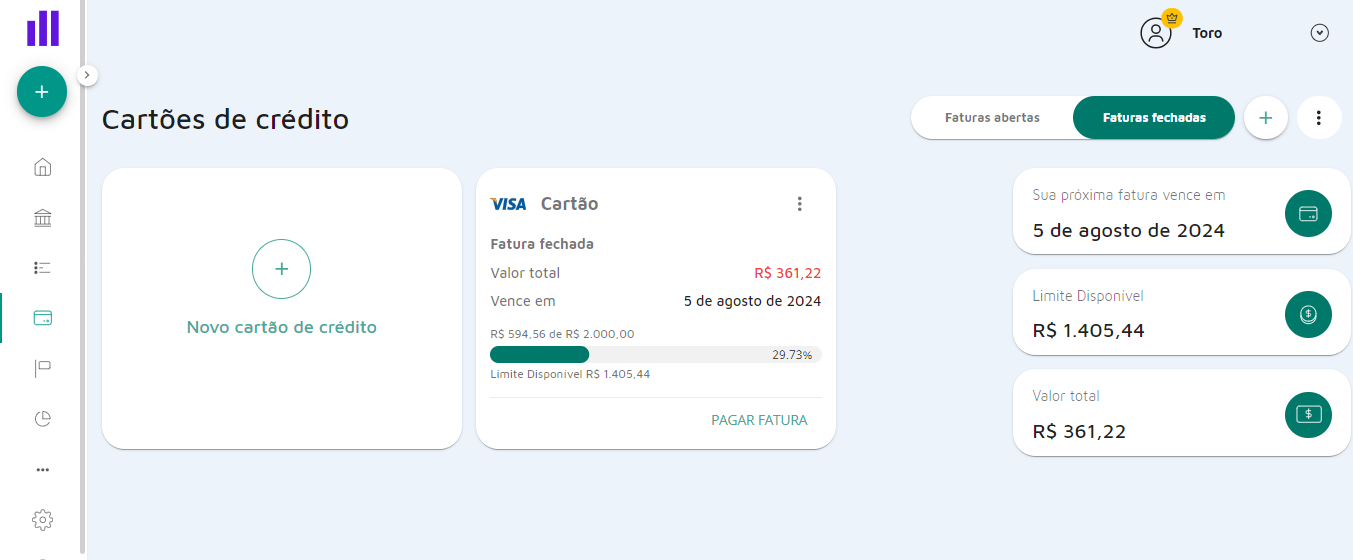 Na tela inicial do seu Mobills web, clique em 'Cartões de crédito' no canto esquerdo > Depois, Escolha o cartão que contém a despesa que deseja ignorar.